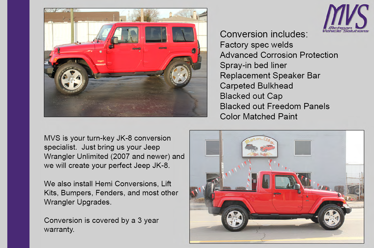 One of our most popular kits to date, MVS worked in conjunction with Mopar Product Engineering to develop this unique concept. MVS built & fabricated this vehicle making its debut at MOAB EJS in 2011. Because of the popularity this Jeep received, including award consideration, we created this awesome kit to take your Jeep to the next level.